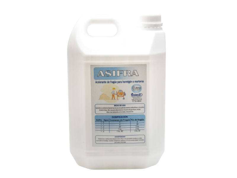 Acelerante de fragüe para hormigón o morteros. Altas resistencias iniciales, desencofrado rápido. Se puede diluir en agua hasta 15 veces su volumen, variando con la dilución la velocidad del fraguado.